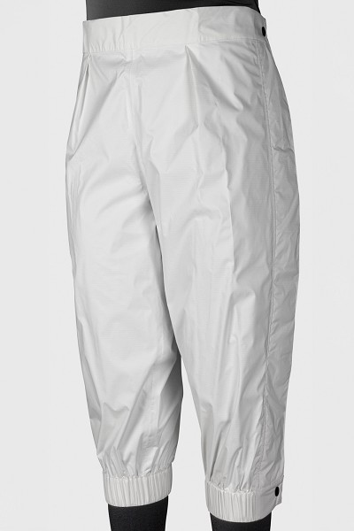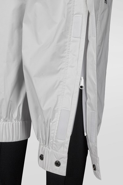 ユニセックスレインパンツ。2サイドジップ。ウエストと裾はゴム入り&スナップボタンでサイズ調整可。ロゴプリント&ロゴ入りボタン。