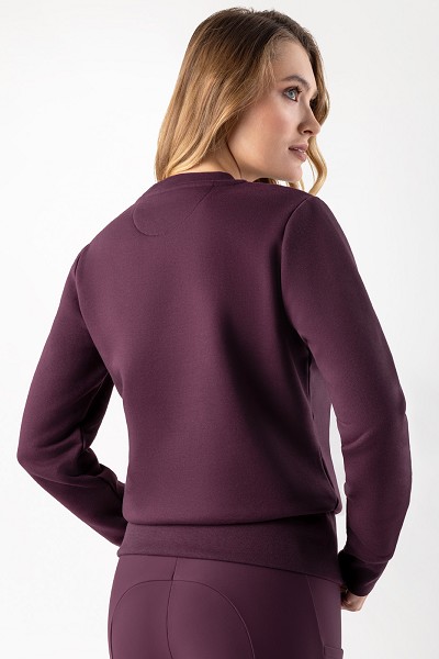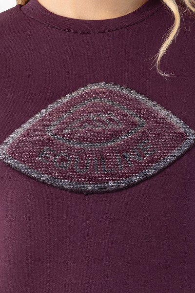 クルーネックスウェットシャツ。スパンコールロゴパッチ。内側フリース生地。裾リブは高めのデザイン。通気性・速乾性・伸縮性抜群。