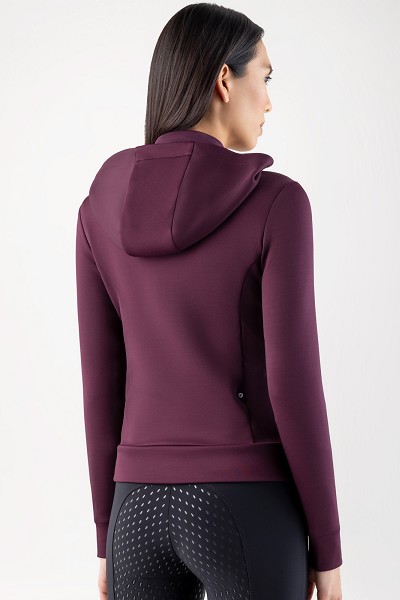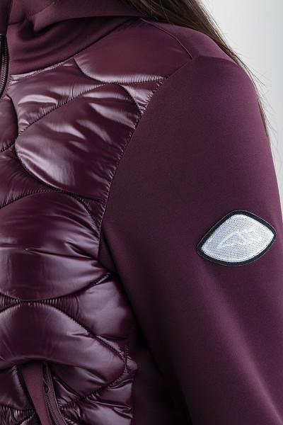 テックスウェット+ナイロン切替ジャケット。フロントは光沢ナイロンキルト。2wayジップ。2ジップポケット。スパンコールロゴパッチ。フードはボタンで固定可。