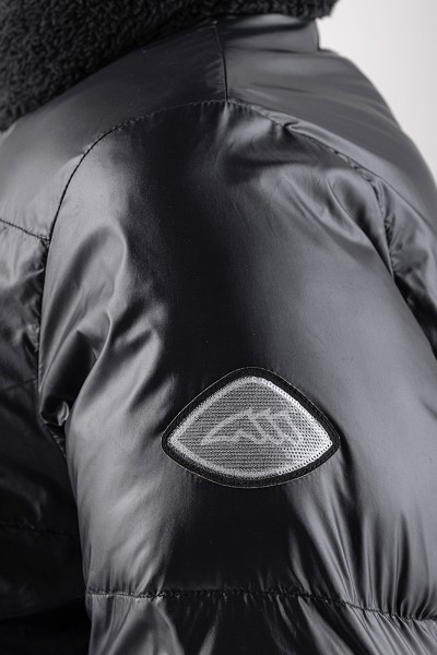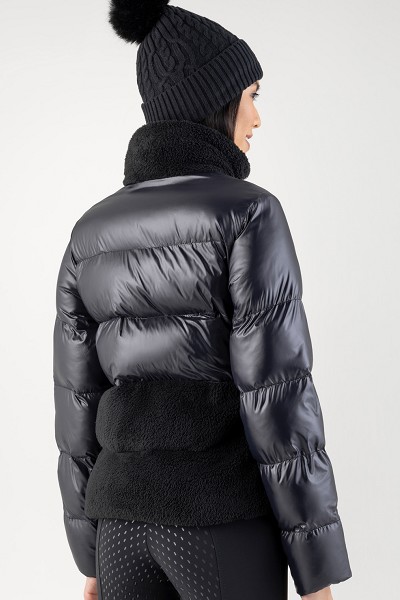 中綿+テディ切替ジャケット。襟と裾にテディーファー。2wayジップ。2ジップポケット。スパンコールロゴパッチ。