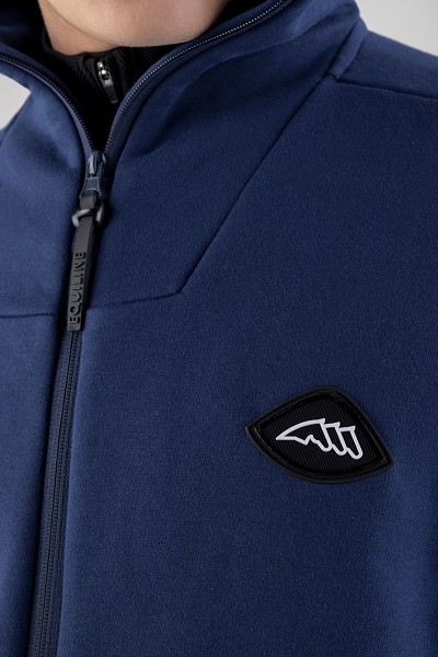 スウェットジップジャケット。内側フリース生地。2ジップポケット。2wayジップ。右側サイド腕下部分にロゴプリント。胸にロゴワッペン。