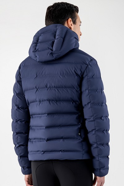 中綿ジャケット。2ジップポケット+内ポケット。2wayジップ。熱圧着キルト。ジップの裏側はロゴテープ。フードはボタンで固定可。