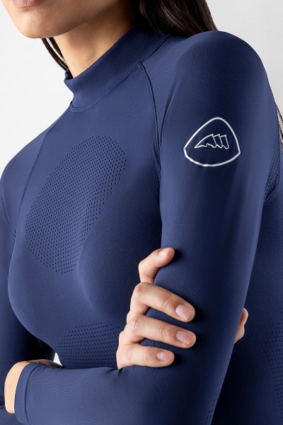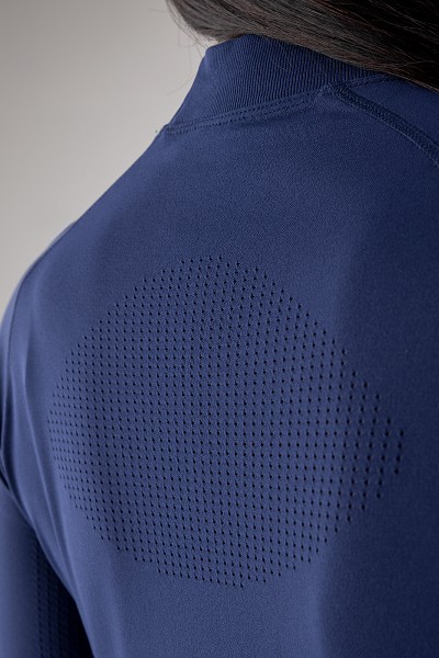 長袖シームレスシャツ。イージーケア&スーパーストレッチ素材。肩にロゴプリント。
