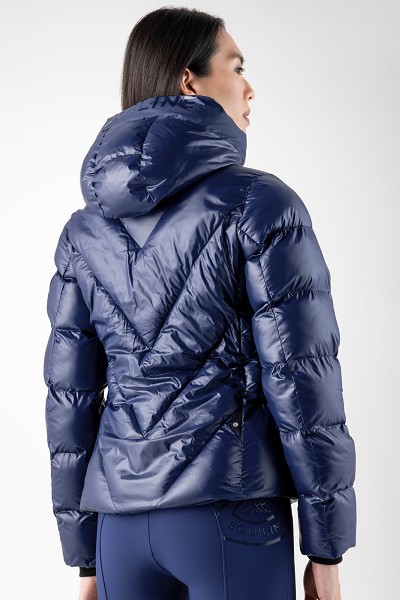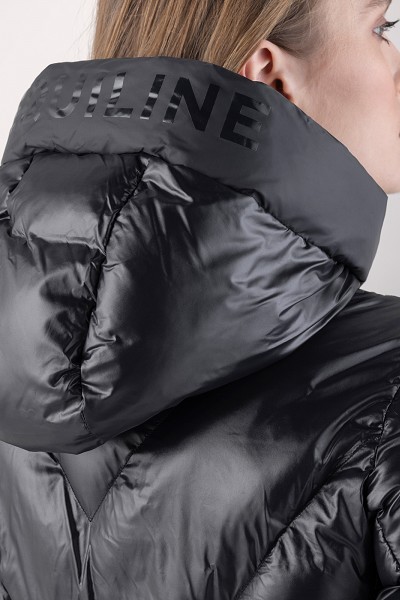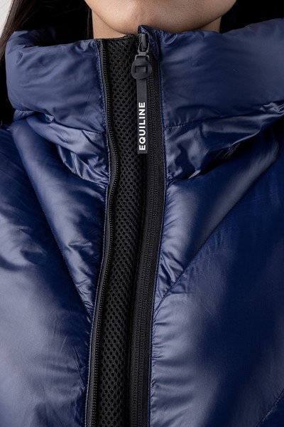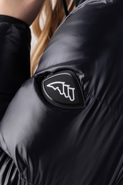 光沢中綿ジャケット。2ジップポケット。2wayジップ。フードに同色ロゴプリント。E-TRWサーモシルバー裏地で体から放出された熱を反射し保温。収納式のフロント3Dメッシュで抜群の通気性を確保!フードはボタンで固定可。